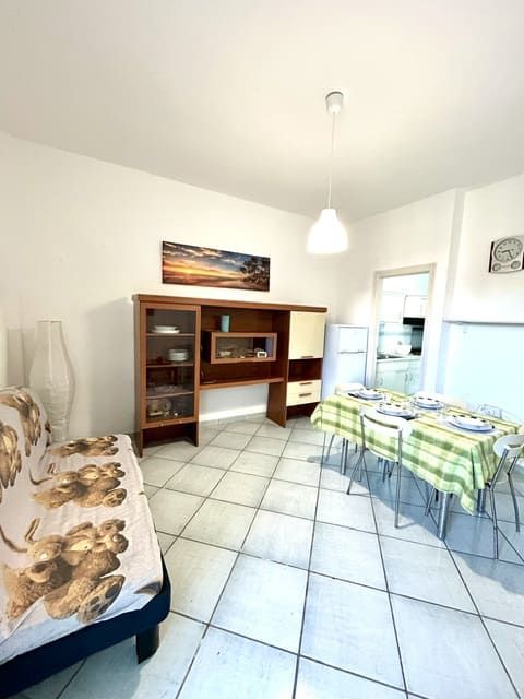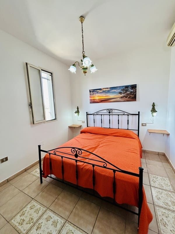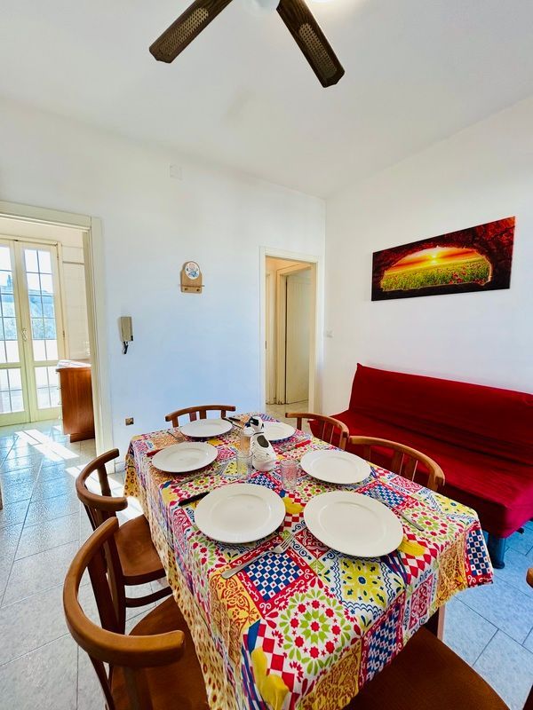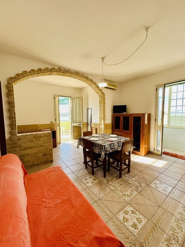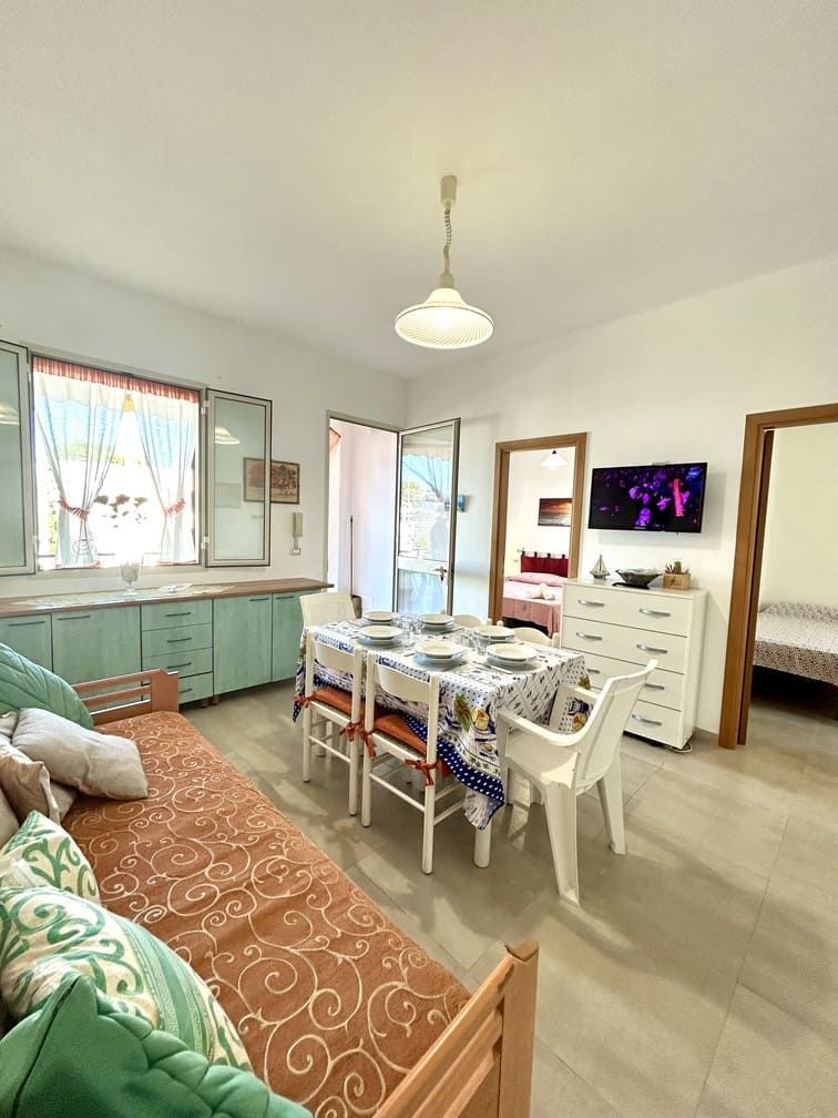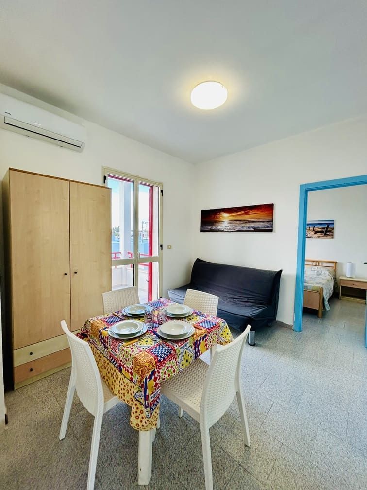 Ingresso con soggiorno con tavolo e sedie, tv e un divano, sulla destra troverete la cucina attrezzata con frigo, piano cottura, forno e tutto il necessario da poter cucinare. Dispone di due camere da letto, una con letto matrimoniale, l'altra con letto singolo estraibile che all'occorrenza diventa per due posti letto, un bagno con box doccia, wc e lavandino. L'appartamento è climatizzato