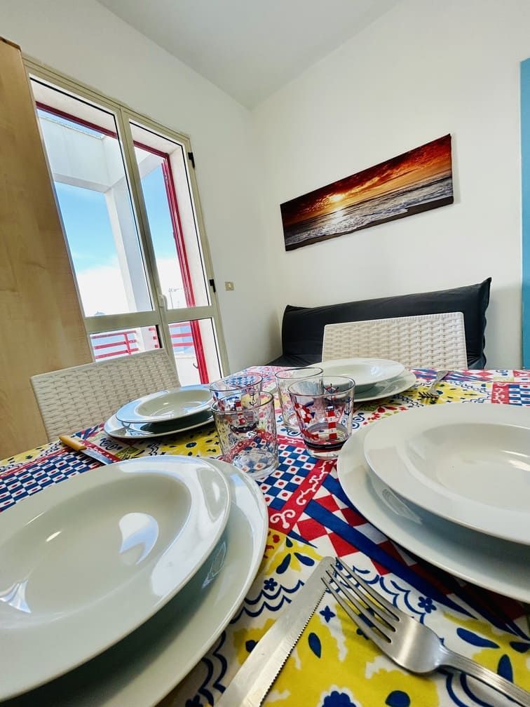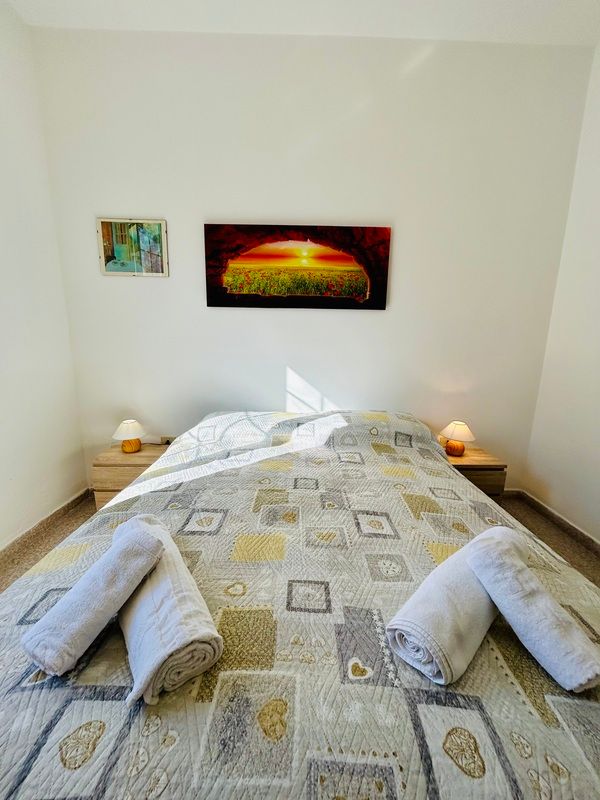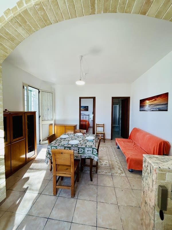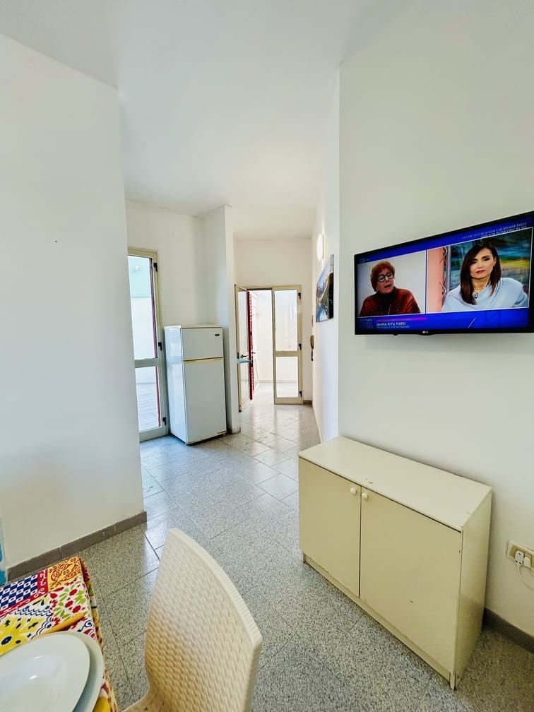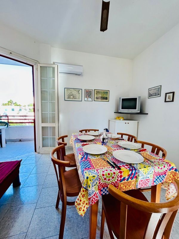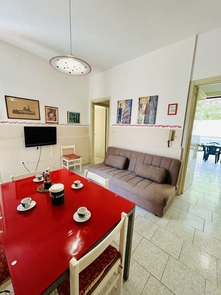 Ingresso con soggiorno con tavolo e sedie, tv e un divano, sulla destra troverete la cucina attrezzata con frigo, piano cottura, forno e tutto il necessario da poter cucinare. Dispone di due camere da letto, una con letto matrimoniale, l'altra con letto singolo estraibile che all'occorrenza diventa per due posti letto, un bagno con box doccia, wc e lavandino. L'appartamento è climatizzato